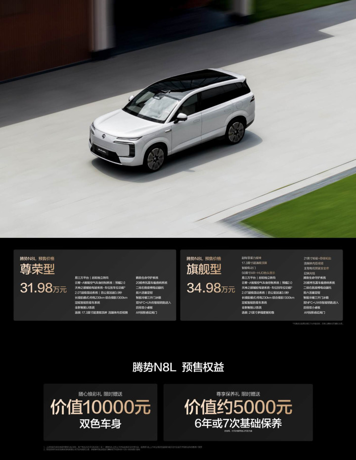 前几天,腾势N8L正式和我们亮相并且开启预售,预售价31.98-34.98万元。这次腾势N8L就是完美继承了N9科技安全豪华的诚意之作,N9是定位科技旗舰SUV股票配资策略,各方面都最求极致,而N8L更加定位更偏向家庭安全豪华,但是又完美继承N9的安全技术和操控性。